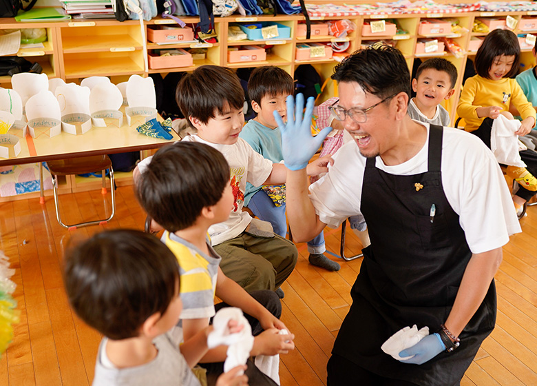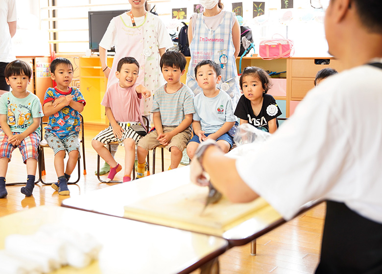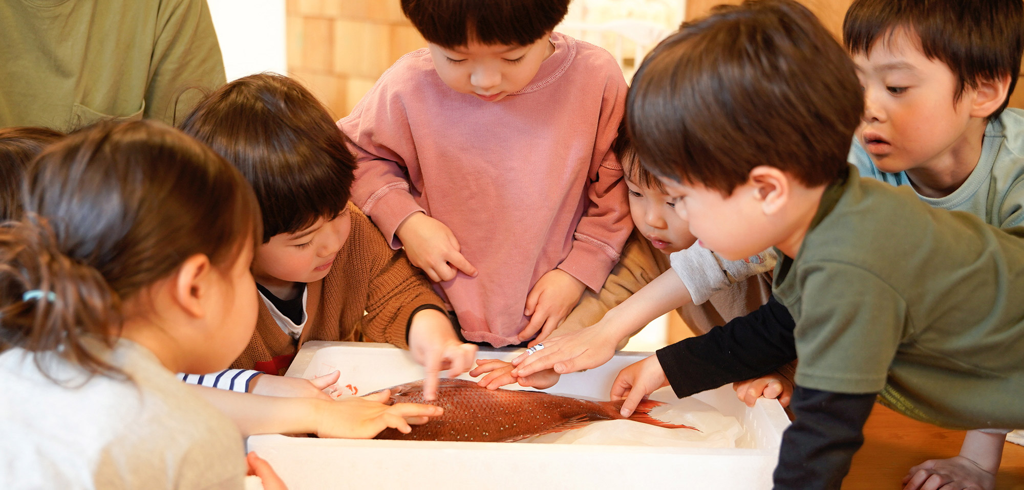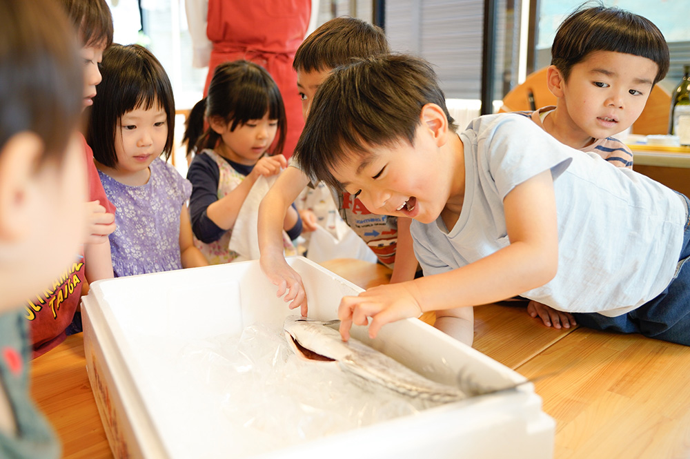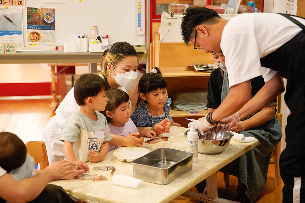 正和学園では「いきいき」という理念のもと、子どもたちが自ら体験し、考え、共有しあい、探究する。そんなきっかけとたくさん出会える場所として保育園を考えています。特に大切な、人類共通の「食」。この一環として「お魚の時間」として北川シェフに来ていただいています。保育園の先生だけではつくれない、リアルな場づくりがとても好評で、子どもたちだけでなく、大人も含めた共通の探究の体験。魚の命や、匂い、調理器具への興味も尽きません。素敵な時間を本当にありがとうございます。