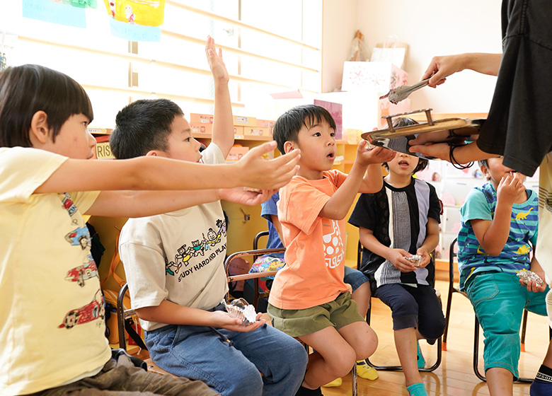 町田こばと幼稚園では、国際バカロレア教育の一環として、おさかなせんせいの時間を設定しています。「いただきます」「ごちそうさま。ありがとう」その意味がわかって手を合わせる時、子ども達の瞳の奥は静かに輝いています。