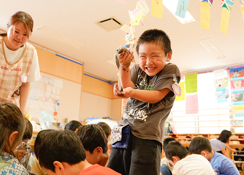 おさかな先生から自然の恵みに感謝して生き物の命を頂くことの大切さを教えてもらっています。まさに食育の原点がここにあると思います。