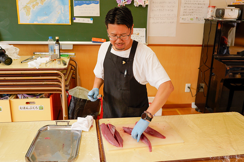 おさかなせんせい®のプログラムでは、私の父が目利きした本物の天然鮮魚に、子どもたちが自由に触れ、命をいただく一連の流れを定期的に体験します。